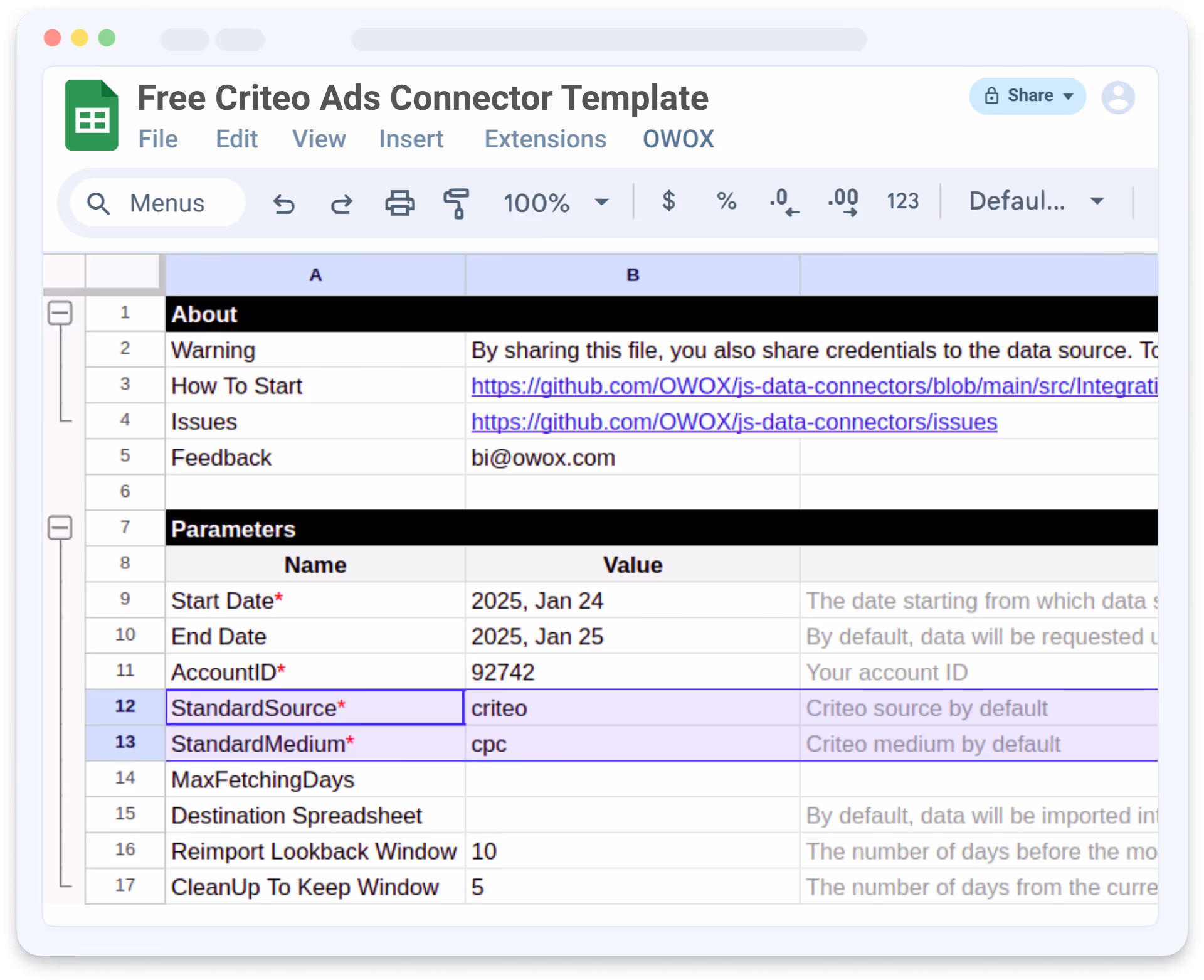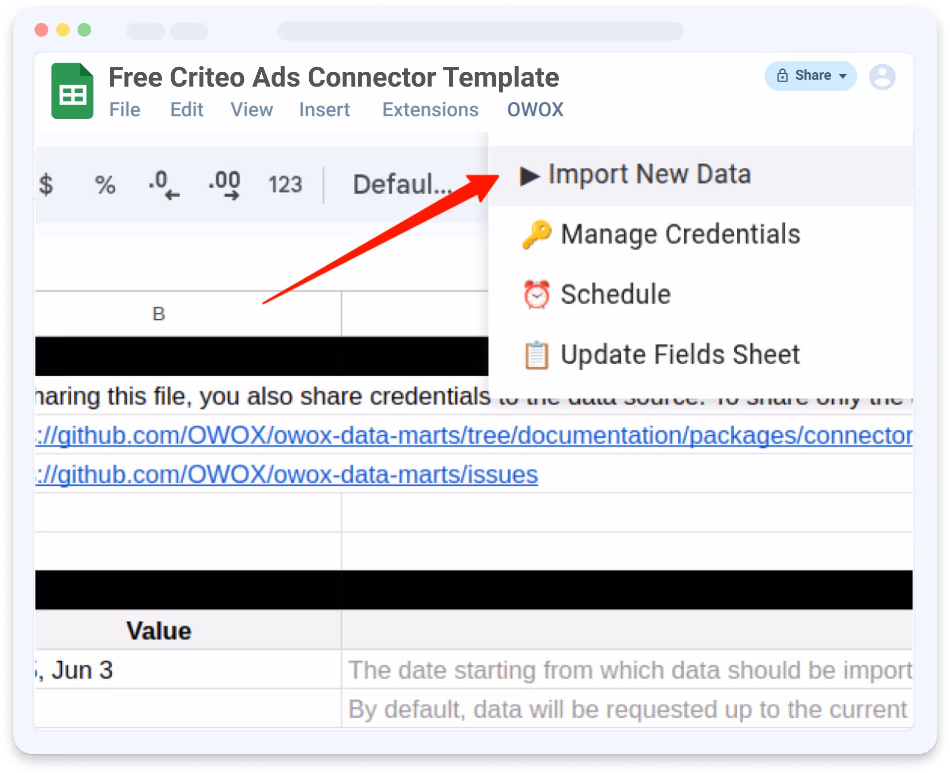 Hit “Import New Data” and your Criteo Ads performance will flow into your Google Sheet – deduplicated, structured, and ready to go.