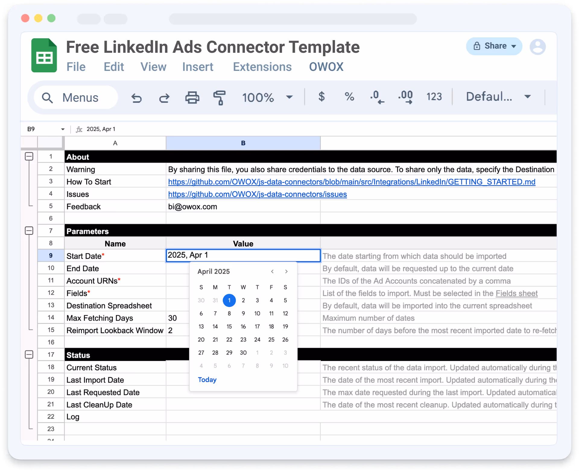 In the Config sheet, define the start Ddate for your data import, your account URN(s) (grab them from your LinkedIn Ads dashboard) and selected metrics and breakdowns in the Fields tab.