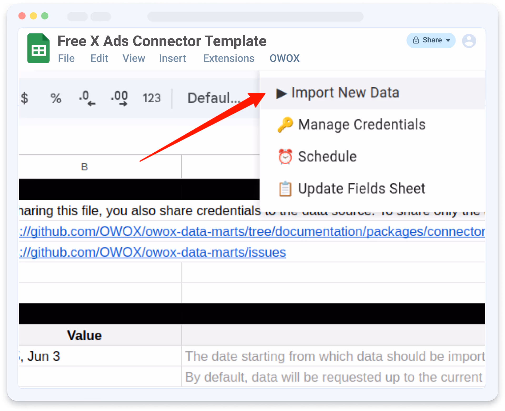 Open the OWOX menu → Manage Credentials, save your tokens, and hit Import New Data. Done.