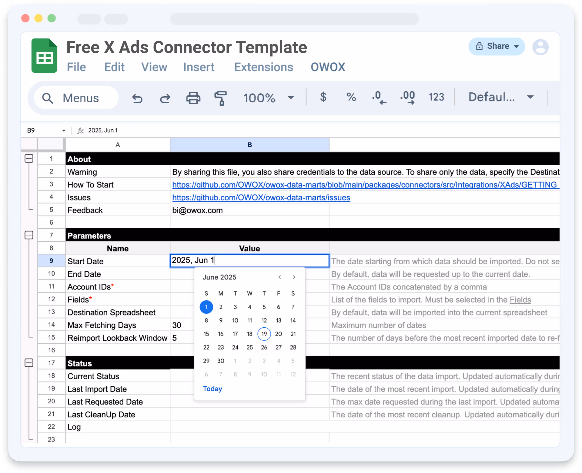Add your tokens, click "Import New Data" – and boom, your X Ads data starts flowing into Sheets.
